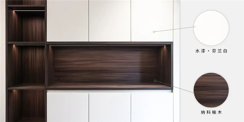 木門則采用特調(diào)的烤漆調(diào)色,與納科榆木的墻、柜形成呼應(yīng),全屋設(shè)計(jì)渾然天成,美在不言之中。
