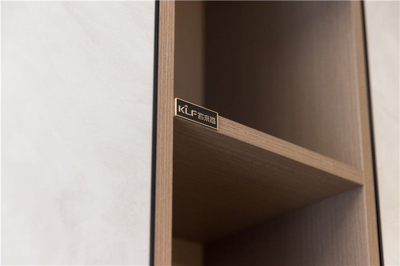 門板為楓影超晶板,亮光屬性與光影配合,為空間增色;中部預(yù)留掏空、整面窄立隔板為開放式構(gòu)造,是小物件、裝飾物的存放地。