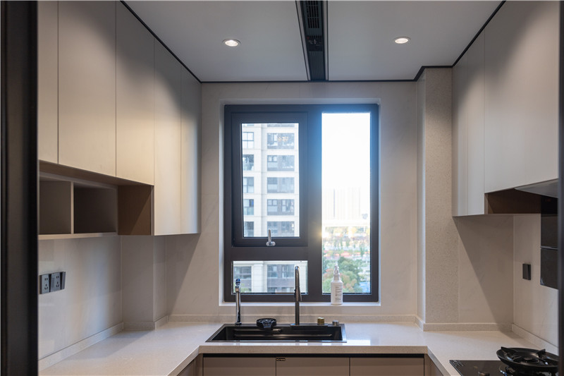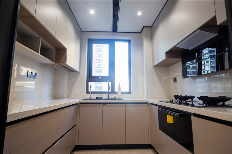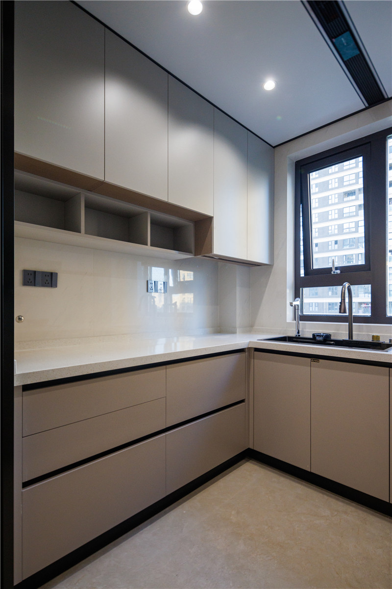 廚房柜體為科技直紋,以膚感帶給居者質(zhì)感體驗;上柜蘭迪灰搭配下柜米灰,溫潤自然;櫥柜U型依墻而建,將烤箱電器嵌入其中,協(xié)調(diào)多物品收納的難題。