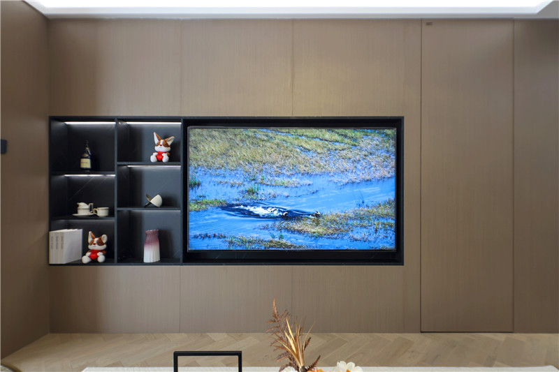 電視背景墻為科技直紋,電視機、裝飾柜深調(diào)嵌入,以視覺差突出美感;沙發(fā)背景墻科技直紋+水漆科技銀梨+柵格設(shè)計+射燈,拼接式彰顯智慧;硬裝與軟裝相輔相成,雅致大氣。