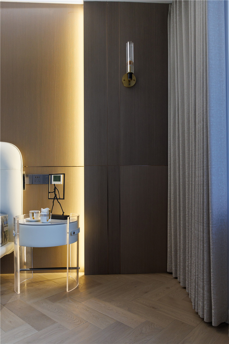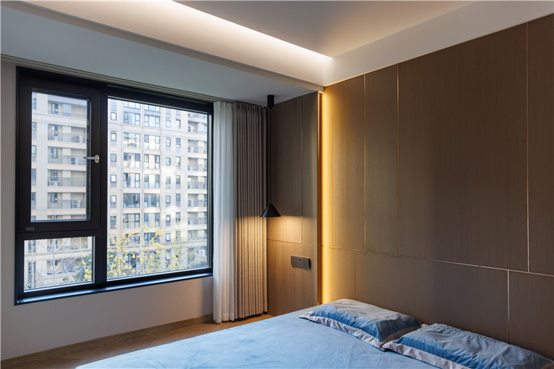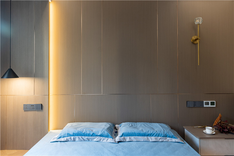 床體整體做抬高處理,下方嵌入暖系輔助燈光,格調(diào)感拉滿;床頭整面背景墻色、光、線層次展現(xiàn),符合小資人群的審美。