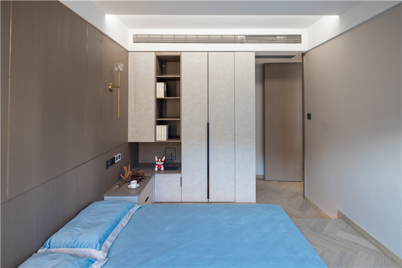 衣柜延伸以主臥的構(gòu)造,差異于延伸床頭柜,柜體科技直紋與水泥灰門板形成跳色,一體化設(shè)計和諧統(tǒng)一。