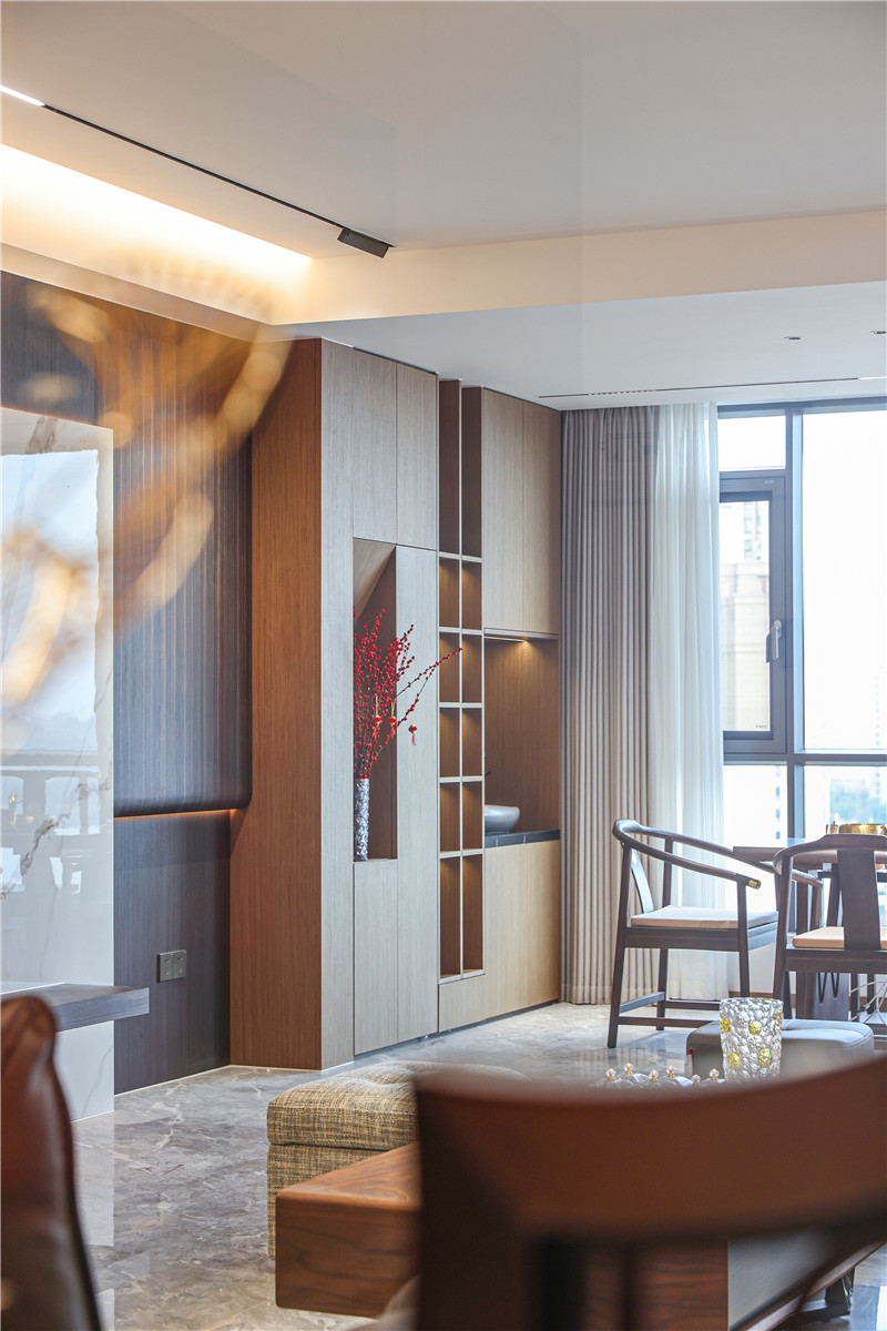 一側(cè)柜體為掛衣存儲(chǔ)區(qū),無(wú)拉手柜門協(xié)調(diào)視覺(jué)、休憩座緩解疲勞,背板加入中國(guó)結(jié)屏風(fēng)隔斷,中式意境突顯。