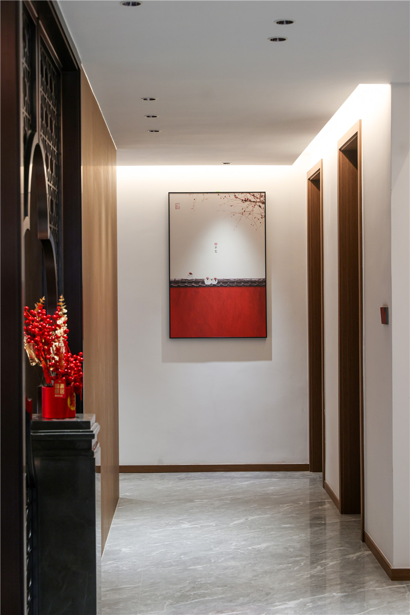 玄關(guān)處的設(shè)計(jì)讓人眼前一亮,柜子以客來(lái)福橡木展現(xiàn)中式設(shè)計(jì)的分量感。