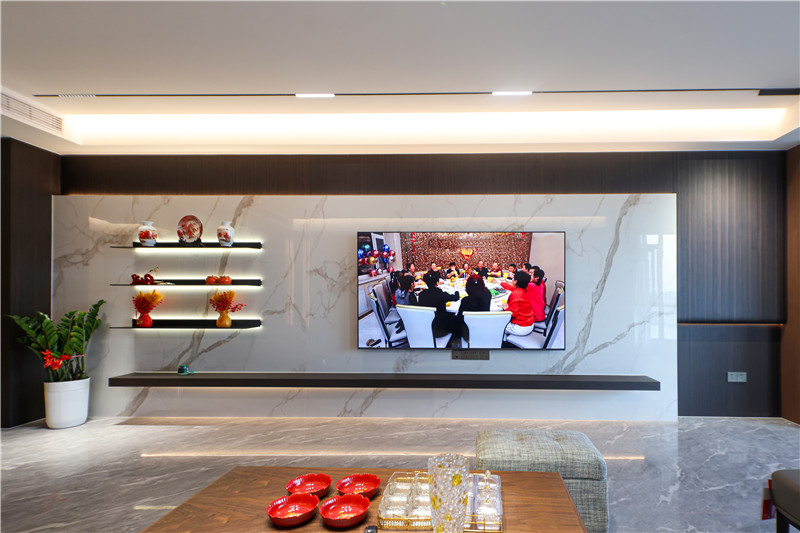 電視背景墻內(nèi)里整面木材拼接整塊大理石板,彰顯層次感;背景墻外嵌鋁板及整面木板,發(fā)揮收納桌及展示柜效用。