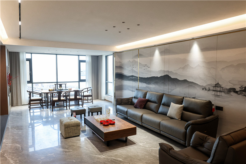 沙發(fā)背景墻采用整面水墨畫,其邊側(cè)以圓弧收邊,方圓間顯古雅風(fēng)韻。