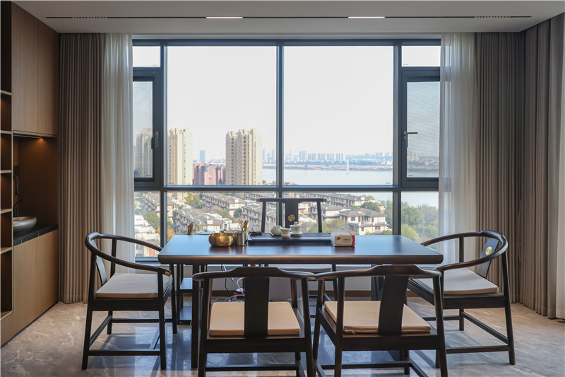 中式復(fù)古風(fēng)配套桌椅,是一家人的歡笑暢聊地;靠墻柜體遵循藏八露二原則,分散家里的收納、洗漱壓力,也是家里的風(fēng)景線。