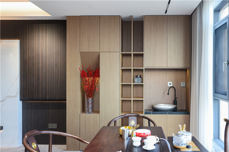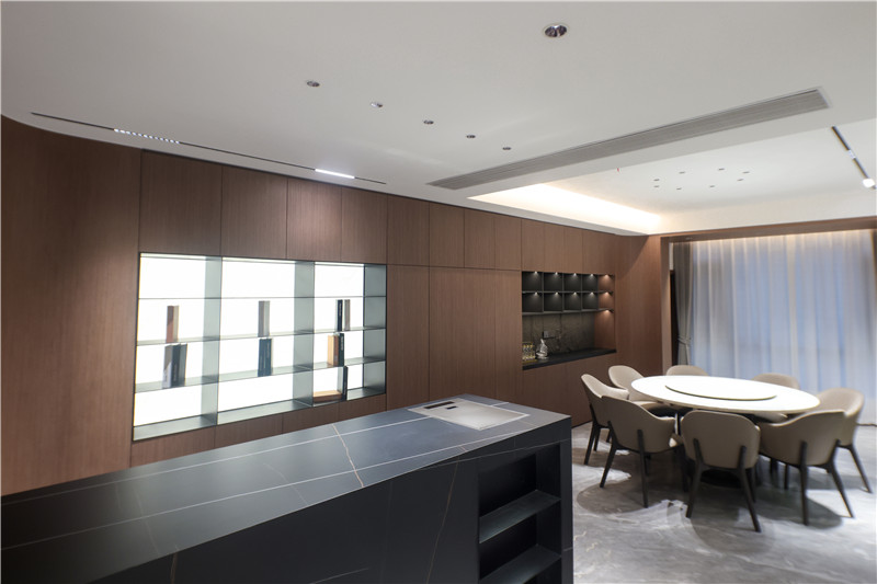 中西結(jié)合式餐廚空間,其餐廚背景墻整面柜體嵌入開放格,可做展示柜、酒柜使用。