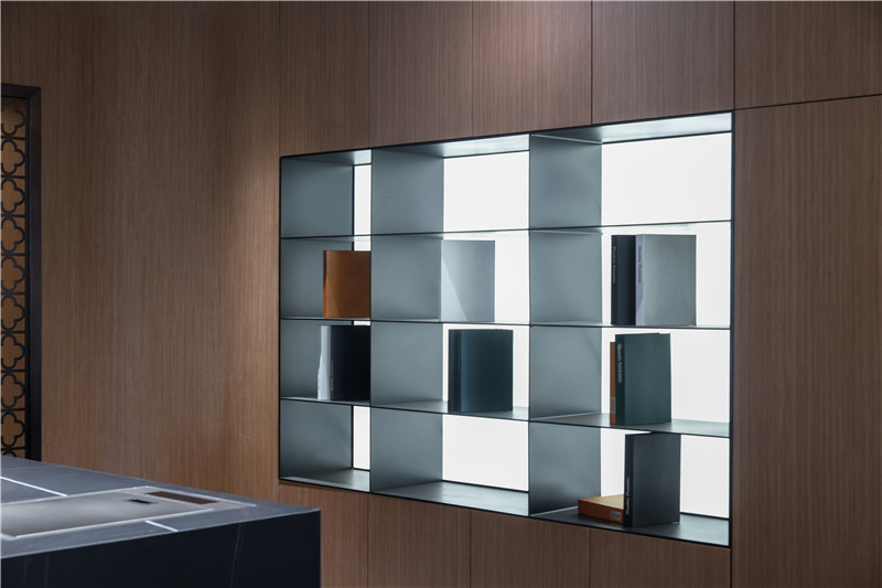 進(jìn)門整面茶白立柜做銑槽拉手,中部霧霾藍(lán)做點(diǎn)綴并加入三角造型,增強(qiáng)空間活潑性;側(cè)邊展示柜以圓弧收邊,安全系數(shù)高。