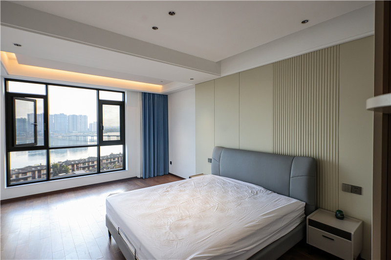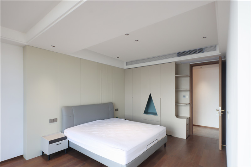 床頭整包嵌入墻體協(xié)調(diào)于整屋色調(diào),配合以細(xì)節(jié)處燈光,妥妥溫居;靠窗多功能收納柜,頂天立地式結(jié)構(gòu)中和收納和裝飾功能。