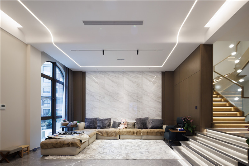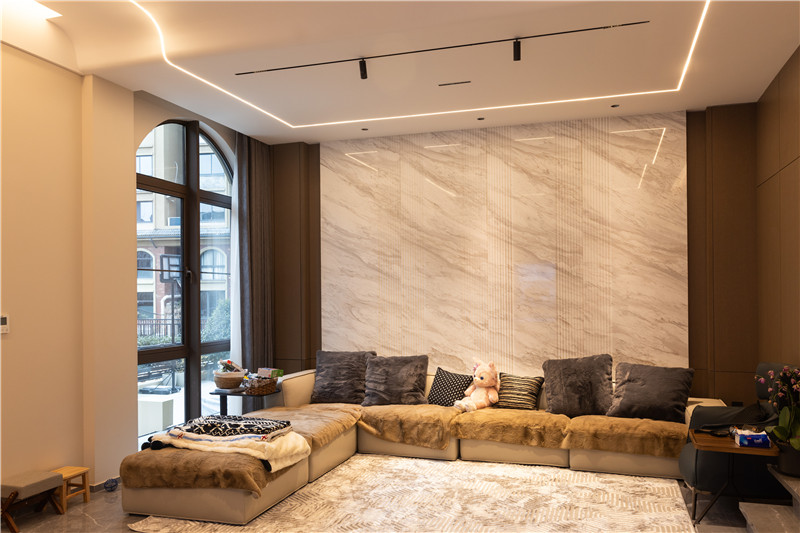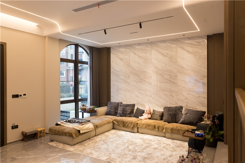 客廳無(wú)主燈設(shè)計(jì)讓空間更加寬闊明亮;懸浮大理石電視背景墻靈動(dòng)不沉悶,背后滿(mǎn)墻的格柵設(shè)計(jì)增加舒適感,緩和輕奢風(fēng)帶來(lái)的疏離,讓空間更加和諧宜居。