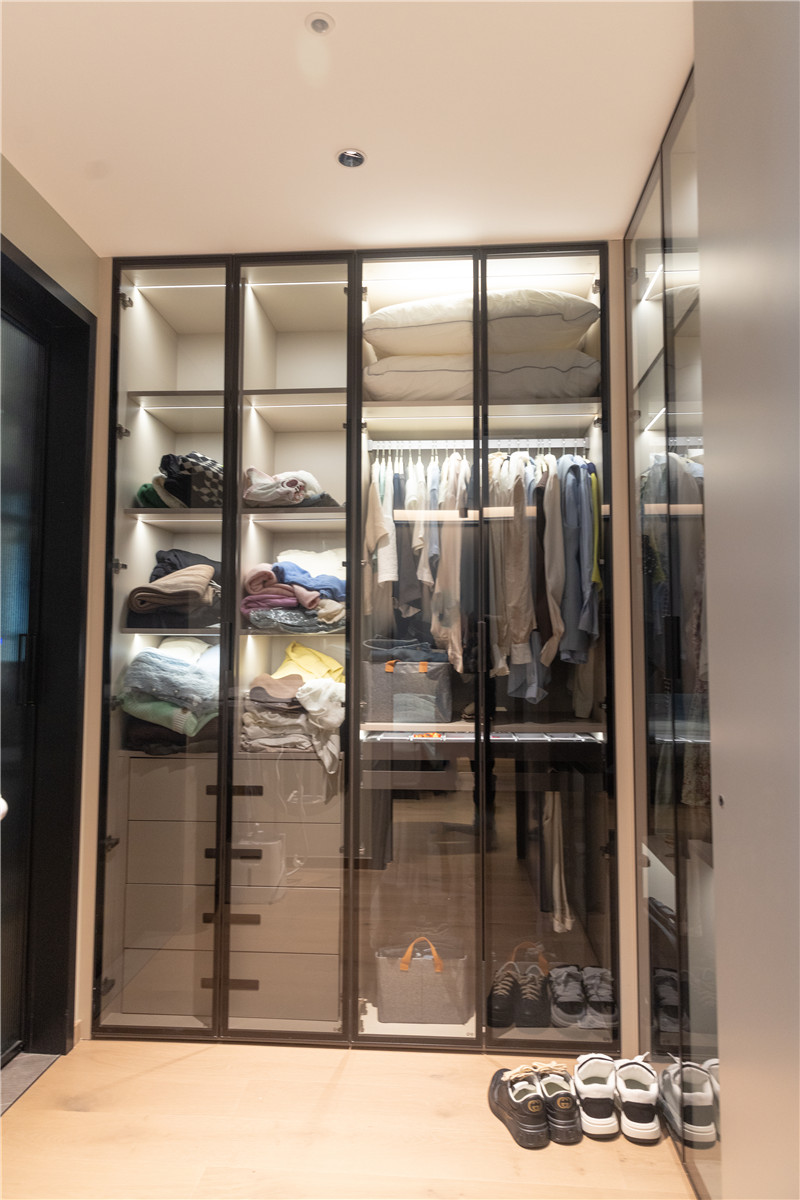 衣柜采用一柜到頂式設(shè)計(jì),免去頂部打掃并增強(qiáng)收納能力。衣柜設(shè)計(jì)黑玻柜門(mén)增加輕奢感,并減緩大面積柜體帶來(lái)的沉悶。