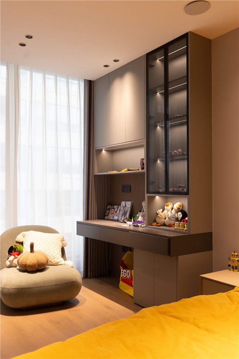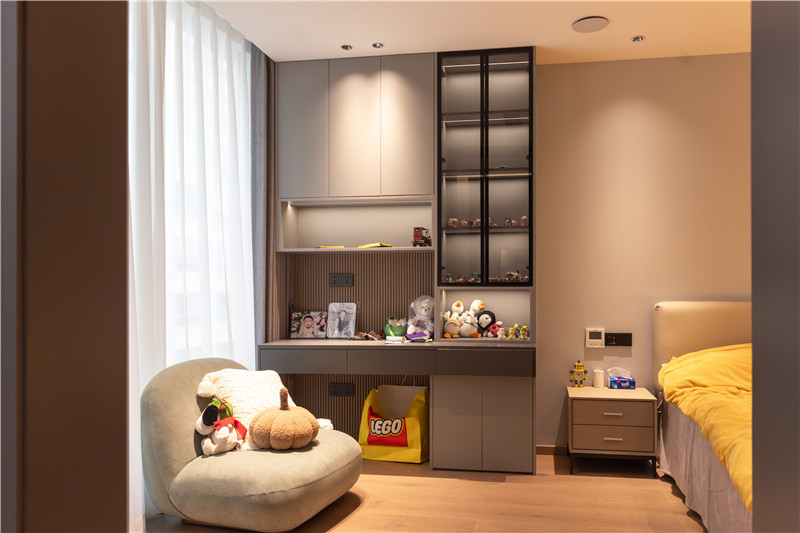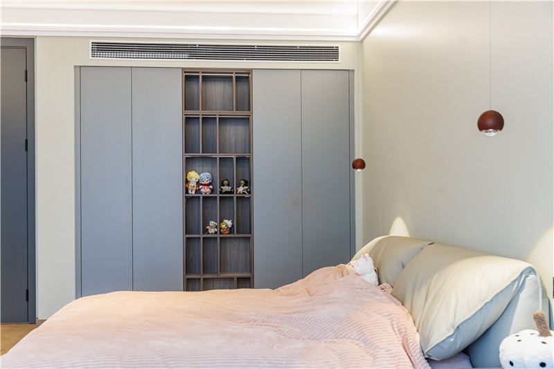該臥室設(shè)計(jì)中部不規(guī)則開(kāi)放柜,放置日常玩偶、手辦、模型等收藏品,符合使用者所需,同時(shí)為衣柜增加了精致與顏值。