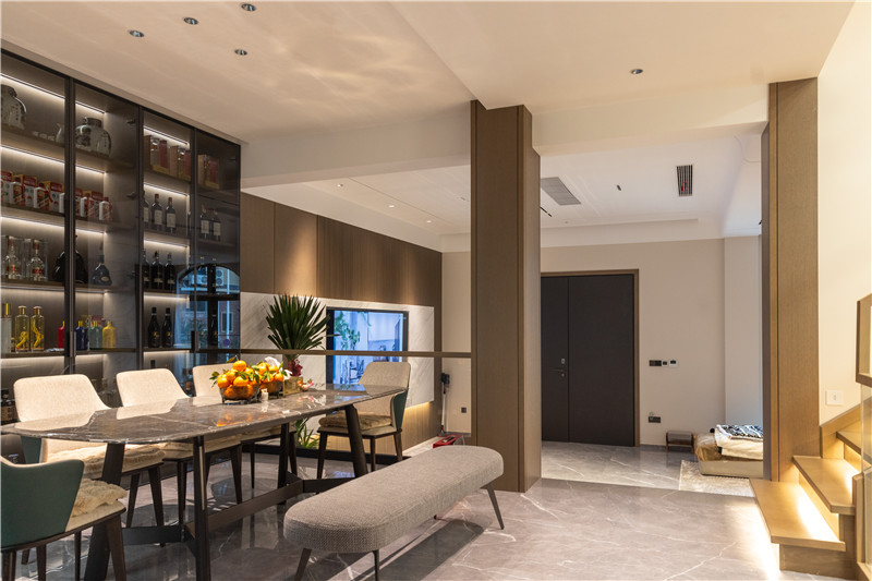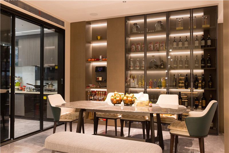 餐廳整體風(fēng)格與客廳一致,暖黃燈光下盡顯奢華氛圍。餐邊柜選用透明玻璃柜門(mén),在內(nèi)置燈帶照射下,奢享優(yōu)雅。