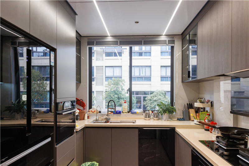 廚房主要以實(shí)用功能為主,將空間利用至理想化。U型布局擁有強(qiáng)大的收納儲(chǔ)物能力,將大型廚電內(nèi)嵌置櫥柜中,減輕客廳收納壓力,做飯也變得更便利。