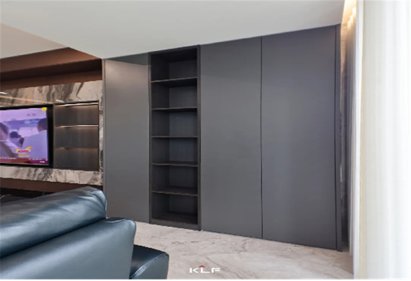 沙發(fā)背景墻被打造成整面收納柜,開放與封閉的組合設(shè)計,讓收納與展示完美融合。