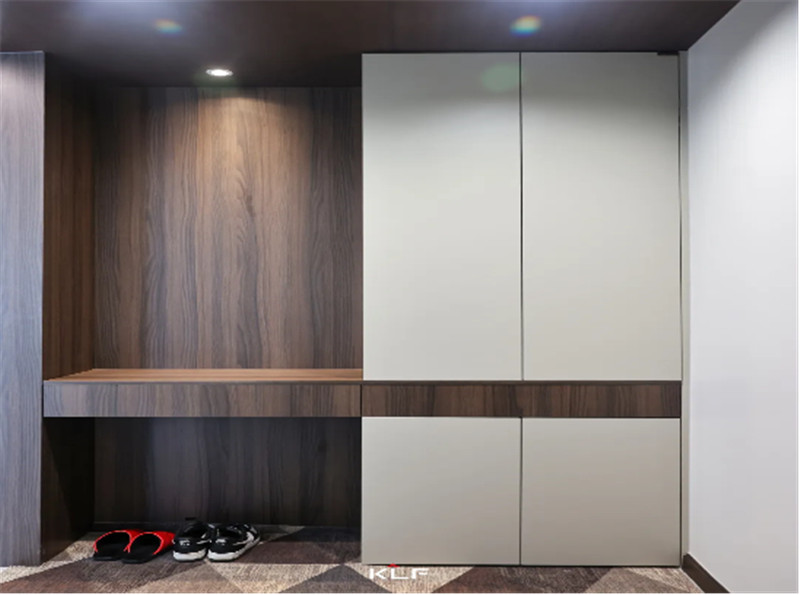 玄關(guān)造型充滿歸家的儀式感,靠墻進(jìn)門一側(cè)做穿插式設(shè)計,木色與白色融合,柔和色調(diào)營造舒適自由的居心之所。