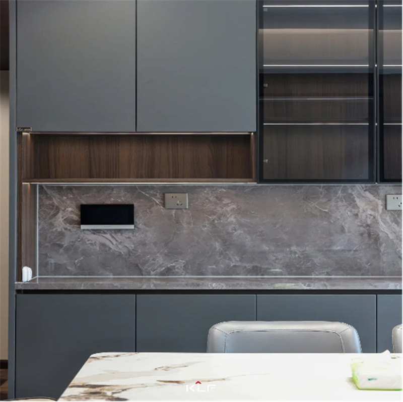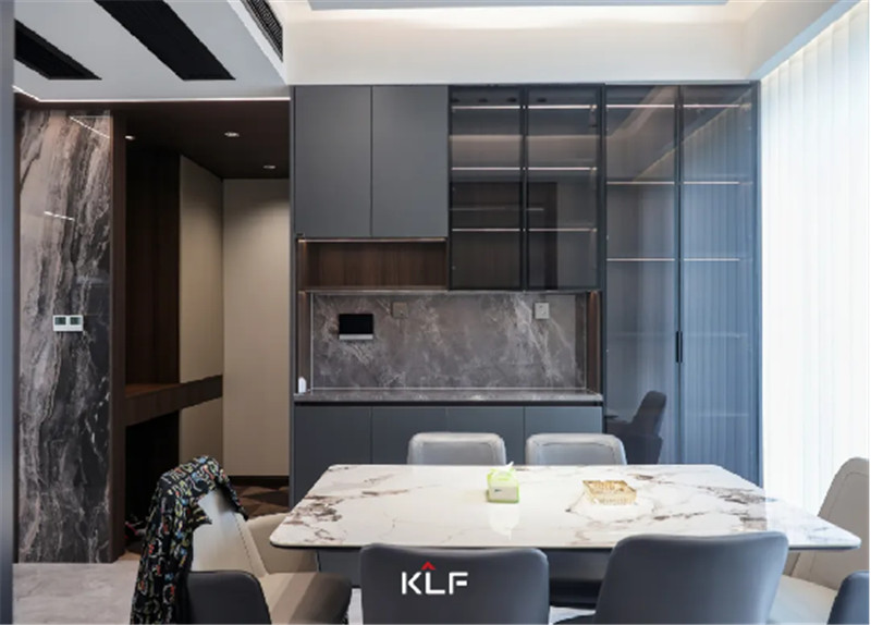 整面餐邊柜立于大理石餐桌一側(cè),儲物及展示功能拉滿的同時,線條和形式的韻律演繹出現(xiàn)代化的家居美學(xué)。色調(diào)柔和、質(zhì)感高級的水漆柜搭配上通透玻璃,清新淡雅,營造典雅雋永的氛圍。