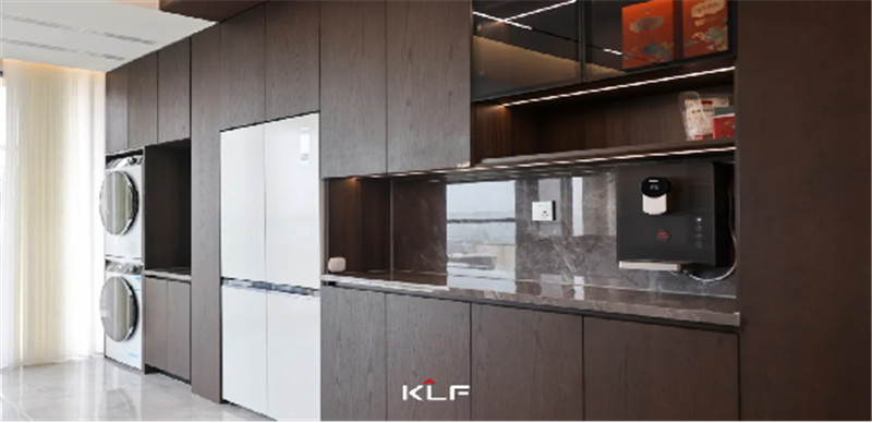 純木色無拉手一門到頂柜,局部選用巖板、玻璃進(jìn)行點綴,高級感拉滿。嵌入式設(shè)計容納了冰箱和洗衣機烘干機,精簡的設(shè)計,給予居者更豐富的視覺感受。