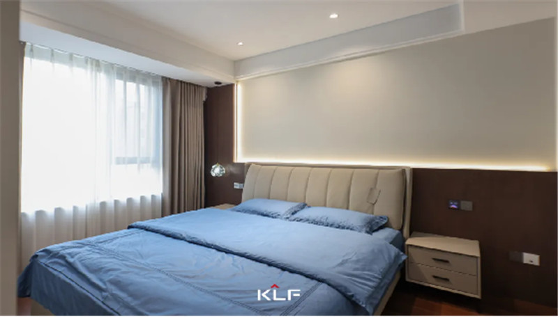 沒有過多繁瑣的裝飾,床具造型簡潔、線條流暢。用木質(zhì)護(hù)墻板打造半高床頭背景墻,恰到好處的留白,空間更靈動。