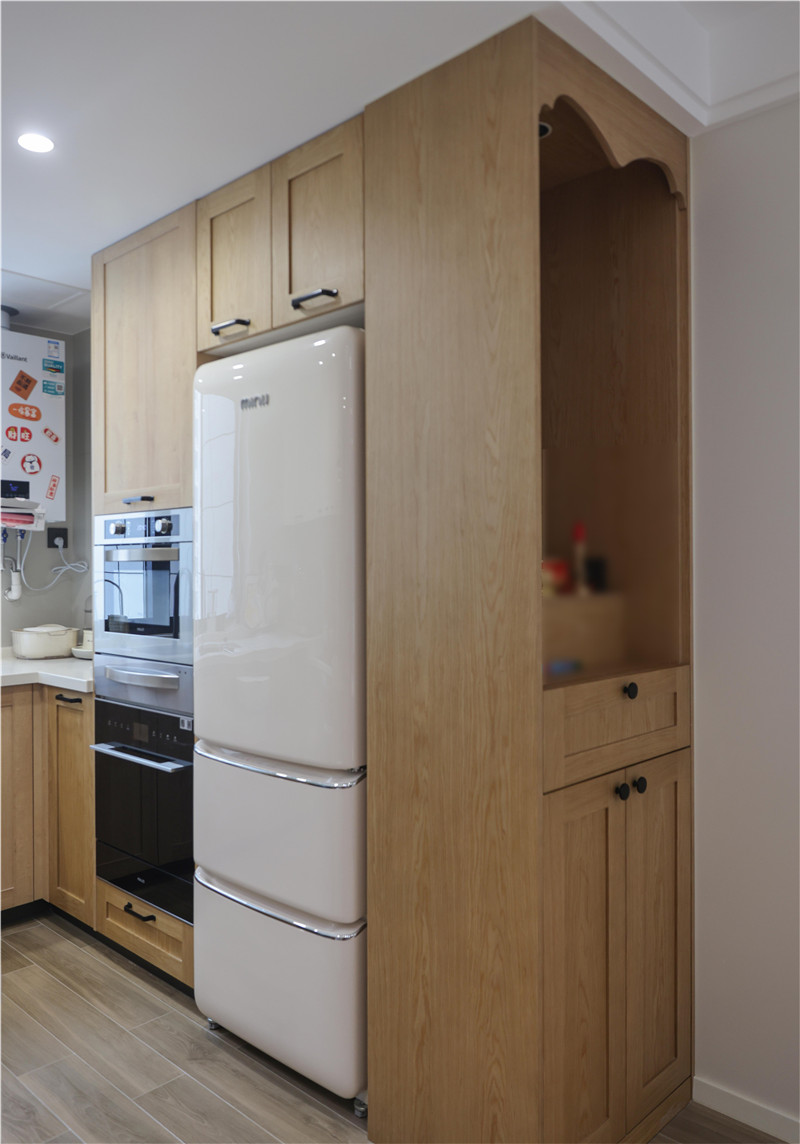 北歐橡木地柜帶有濃郁自然氣息的木作肌理,在空間中流露出精妙變化,與溫潤(rùn)內(nèi)斂的芬蘭白吊柜形成視覺反差,豐富的空間層次讓四方食事更具質(zhì)感。