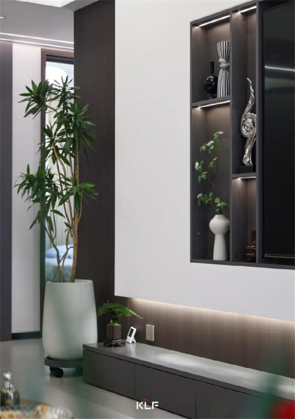 高級灰的色調(diào)在客廳間無限蔓延,開放格電視柜、極簡線條背景墻、無主燈設(shè)計產(chǎn)生簡明的節(jié)奏和呼吸感,娓娓道來,予人舒適優(yōu)雅的寧靜。