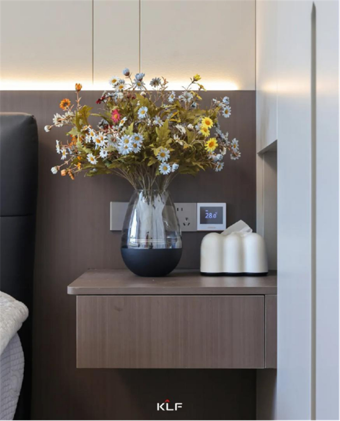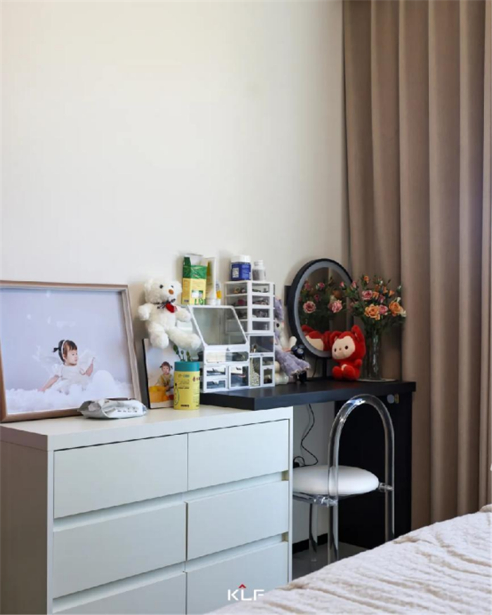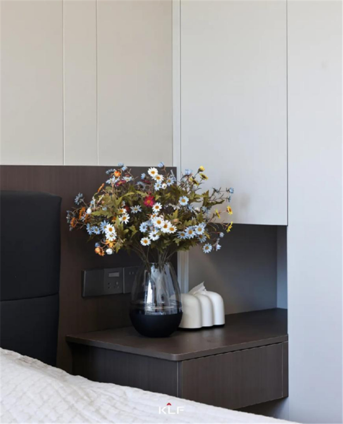 為了避免床尾滿墻柜帶來(lái)的壓抑,床尾巧妙設(shè)計(jì)了梳妝臺(tái)斗柜,簡(jiǎn)潔實(shí)用。懸挑設(shè)計(jì)帶來(lái)輕盈的呼吸感,彰顯精致優(yōu)雅的生活儀式感。