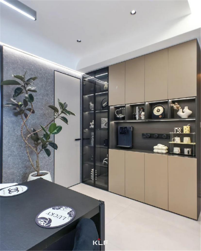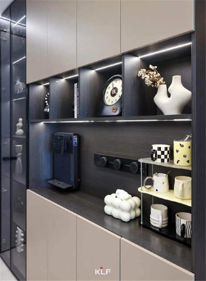 經(jīng)過(guò)光影的催化,一番溫和自然的生活圖景便呈現(xiàn)在眼前。低飽和度的素色渲染出寧?kù)o淡雅的調(diào)性,整面通頂餐邊柜中間做挖空設(shè)計(jì),放置常用物品,安裝軌道插座,讓餐廳功能更加強(qiáng)大。
