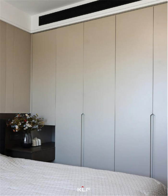 茶白衣柜與床頭背景墻流暢過(guò)渡,延伸床頭柜與半高護(hù)墻板自然銜接。分割塊面構(gòu)建起錯(cuò)落有致的層次感,設(shè)計(jì)以體塊穿插和色塊交融的方式界定空間秩序,描摹內(nèi)在的節(jié)奏和藝術(shù)感。