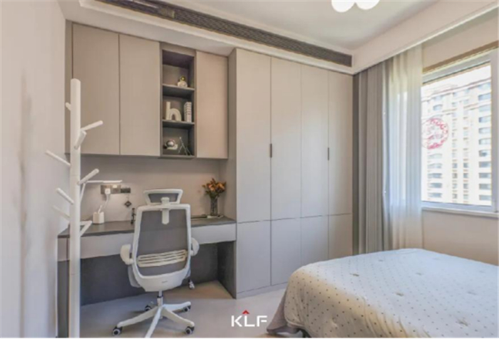 次臥,睡眠區(qū)和書(shū)房巧妙地合并在一起,不僅實(shí)現(xiàn)了功能的多樣化,更通過(guò)精妙的布局和選材,提升了空間的通透性和舒適度。柔和的配色演繹出和緩的空間節(jié)奏,簡(jiǎn)單中散發(fā)著一種沉穩(wěn)安定的情緒感染力。