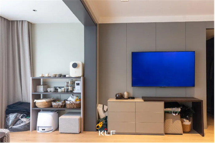 滿墻格柵設(shè)計(jì)增加舒適感,緩和輕奢風(fēng)帶來的疏離,讓空間更加和諧宜居,客廳無主燈設(shè)計(jì)讓空間更加寬闊明亮。