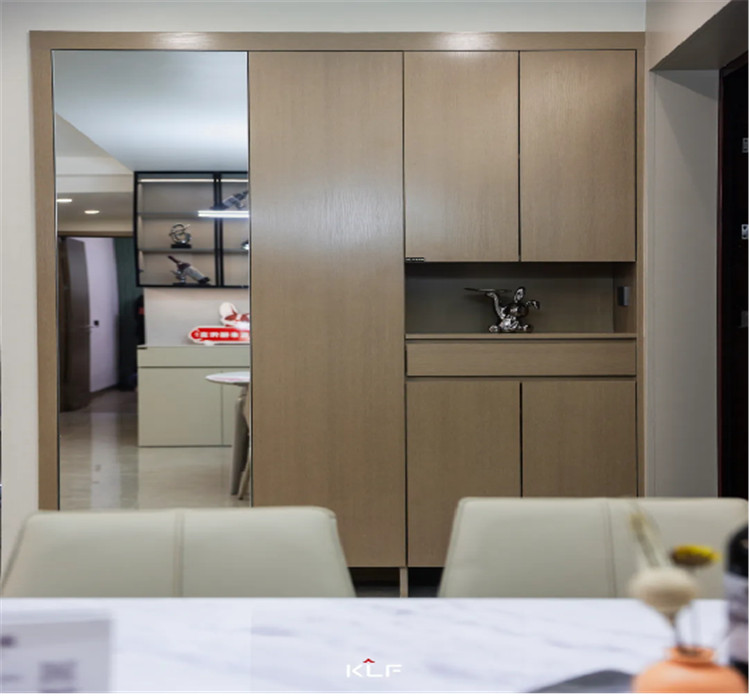 餐邊柜與護墻板色調(diào)統(tǒng)一,顯得空間和諧寬敞;玻璃吊柜內(nèi)置燈帶,既起到調(diào)節(jié)大面積茶白色帶來的素凈氛圍,又很好呈現(xiàn)輕奢風強調(diào)的精致細節(jié);免拉手設計簡約實用,也減少日??呐?。