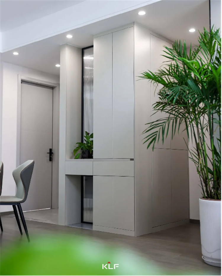 在餐廳與衛(wèi)生間的區(qū)域間以一組隔斷柜去進行空間美化,穿插的設(shè)計手法以抽屜分隔整個高柜,整體尺寸更加協(xié)調(diào),中部加入長虹玻璃的設(shè)計可以搭配綠植或是手辦擺件,整體會更精致。