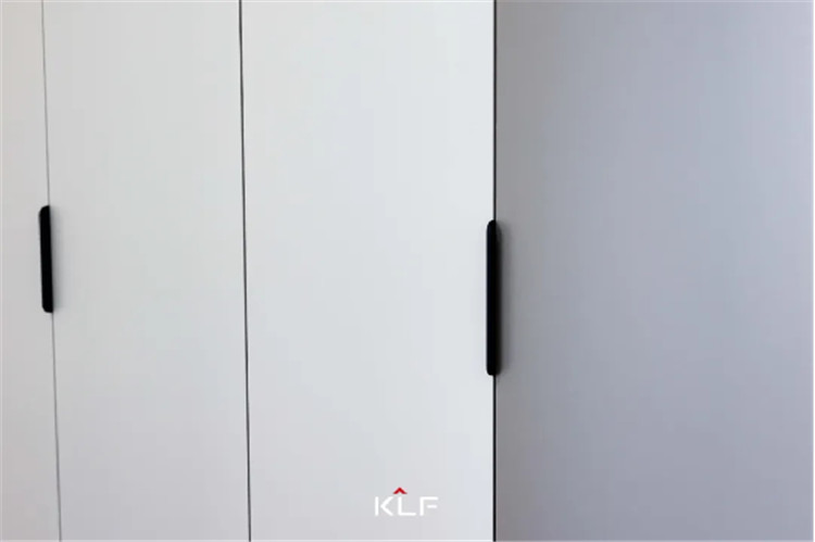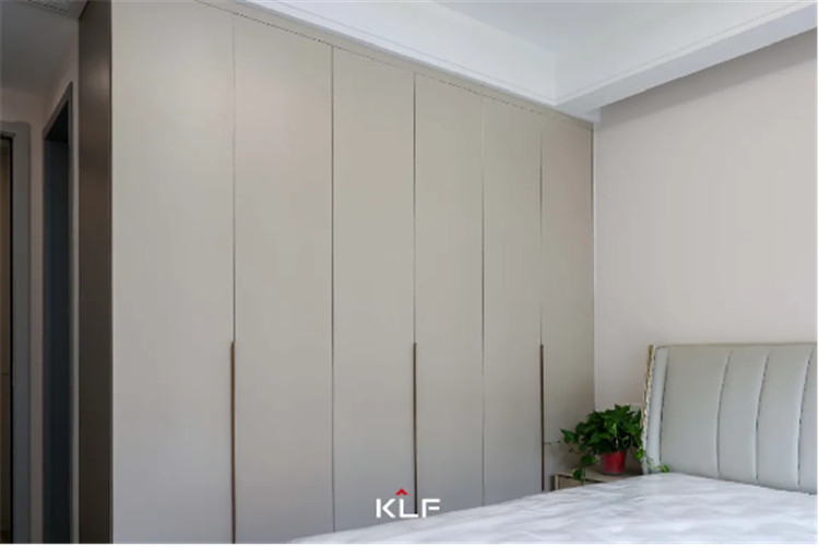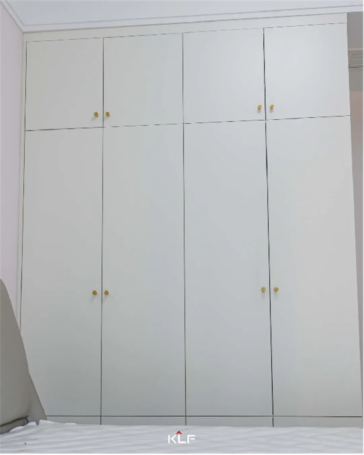 主臥室作為屋主的休息區(qū),整體更強調(diào)收納性和舒適度,采用茶白的色彩與全屋白色系更適配,一門到頂?shù)恼乓鹿癫捎玫氖且蛔中屯w拉手,方便使用。
