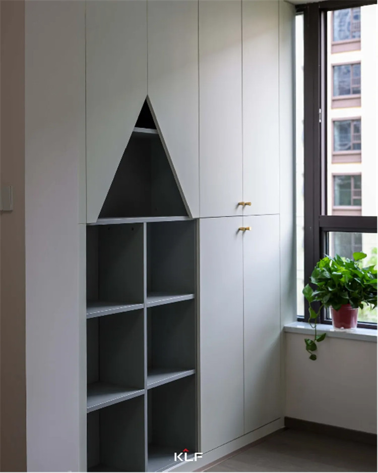 電視柜一側(cè)做了隱形門,讓屋內(nèi)的兒童房更加隔音,更具私密性。墻板一側(cè)做了格柵,偶然的跳脫豐富了整體的設(shè)計,門墻柜一體化的設(shè)計也從視覺上讓空間看起來更干凈,顯大又高級。