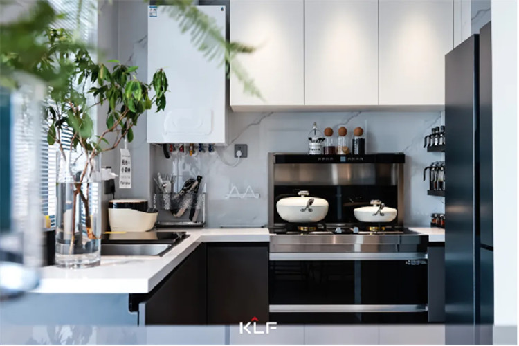 簡單利落的要求同樣運用在開放式餐廚空間中。利用好轉角空間打造U型廚房布局,是黃金動線,更是美味人生的刻不容緩。