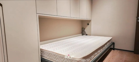 衣帽間采用“一門到頂”的設計,柜體與墻面接縫處不留縫隙,減少衛(wèi)生死角。衣柜內(nèi)部結構合理,分區(qū)明確。銑槽拉手柜門平整順滑,強迫癥黨看了表示超舒服。折疊床柜一體設計暗含巧思,打開便是一張折疊床,偶有客人留宿不是問題。