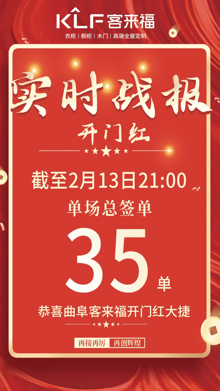 眾多客來福新款產(chǎn)品,款式新穎,時(shí)尚環(huán)保,個(gè)性化量身定制,吸引了眾多業(yè)主前來參觀咨詢,客來福新款產(chǎn)品得到業(yè)主們的肯定,下單火熱。截至2月13日,曲阜客來福門店取得了累計(jì)簽單35單的佳績。
