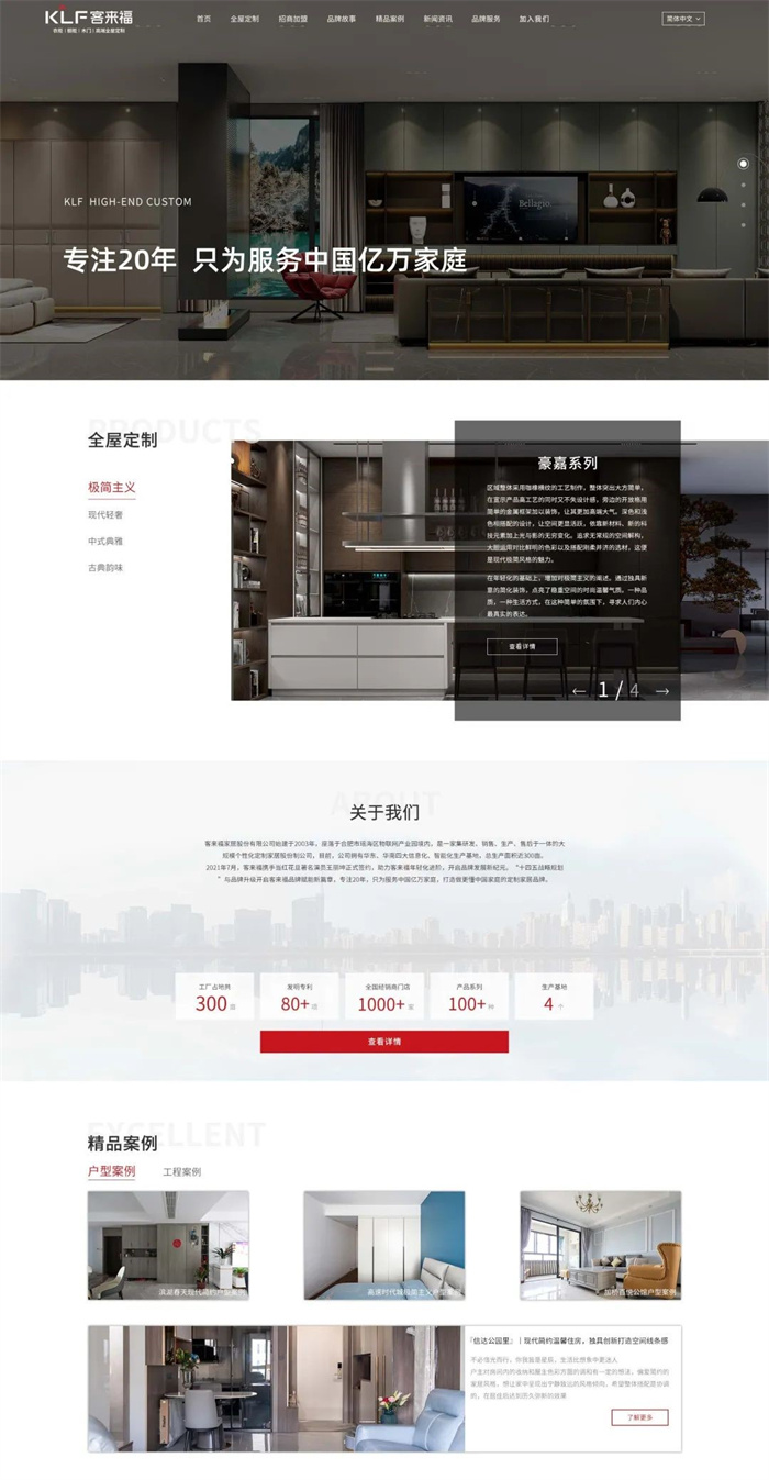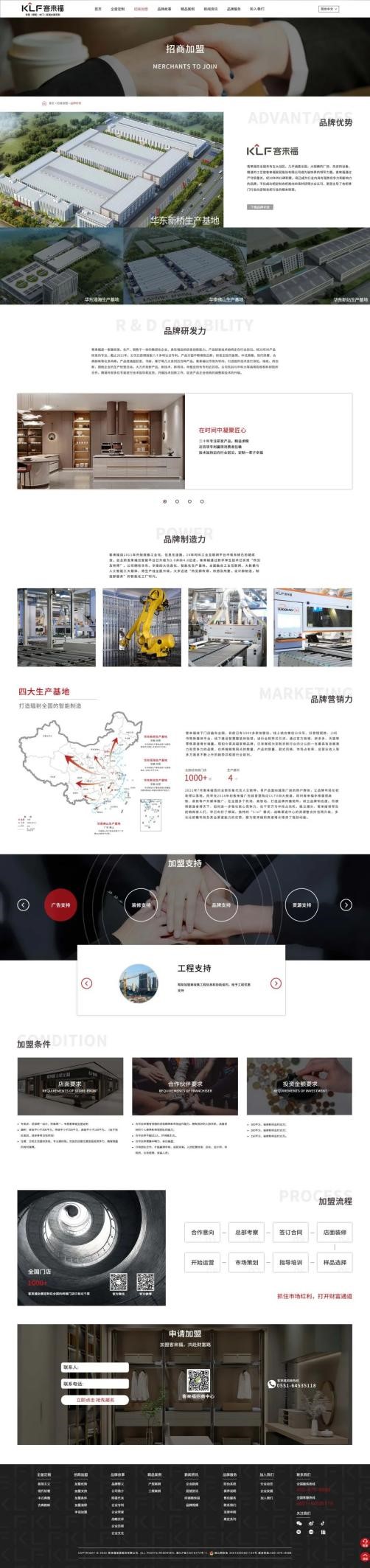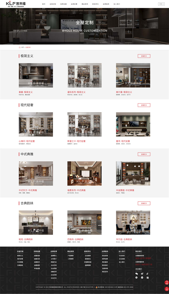 官網(wǎng)內(nèi)容定位上我們也進(jìn)行了進(jìn)一步明確,以“全屋定制、招商加盟、品牌故事、精品案例、新聞資訊、品牌服務(wù)、加入我們”七大版塊為主,分類清晰,排版主次分明。整體圖文并茂、便捷明了,讓用戶一鍵點擊,即可第一時間直觀了解到關(guān)于客來福最新的品牌信息。