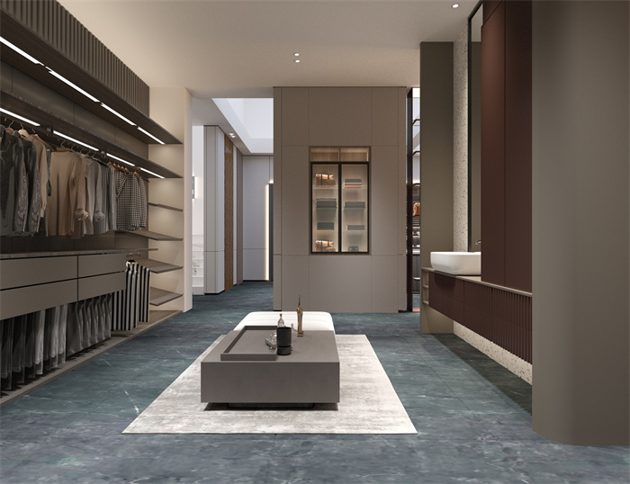 衣帽間的整體設(shè)計(jì)簡潔明朗,客來福創(chuàng)新性采用線性的流體意境與交織的“平行線”,讓整個衣帽間井井有條,大方美觀。生活的高雅追求,在這里體現(xiàn)得淋漓盡致。
