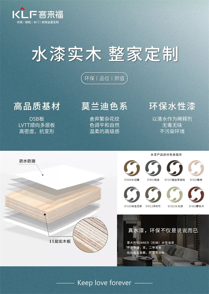 水漆產(chǎn)品為什么能定位高定產(chǎn)品?這源于它本身的優(yōu)勢(shì),目前市場(chǎng)上涉足的品牌少之又少,而客來(lái)?,F(xiàn)已經(jīng)具備水漆產(chǎn)品的研發(fā)、設(shè)計(jì)、生產(chǎn)能力。