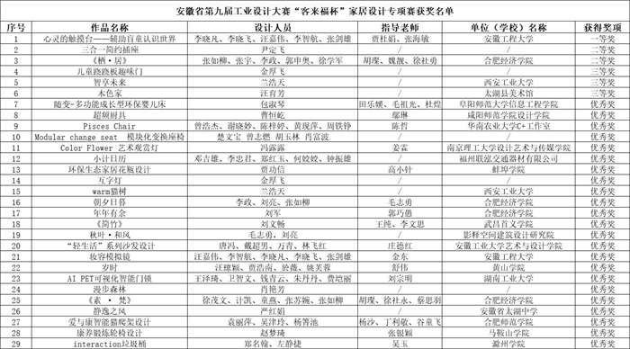 通過(guò)專項(xiàng)賽評(píng)審,根據(jù)評(píng)審結(jié)果,現(xiàn)將安徽省第九屆工業(yè)設(shè)計(jì)大賽“客來(lái)福杯”家居設(shè)計(jì)專項(xiàng)賽獲獎(jiǎng)作品名單予以公示。