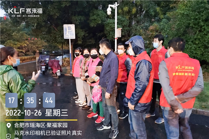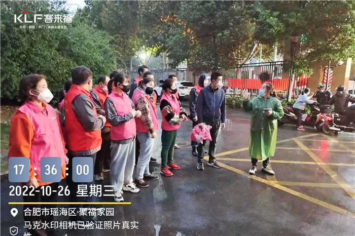2022年10月26日17點,接城東街道通知,聚福家園疫情分菜缺人需要協(xié)助,客來福立即組織第一批18位志愿者于17點35分到場幸福家園東門。后接通知人手不夠,公司立即又組織10名員工組成志愿者隊伍到場分菜。20點鐘左右物資到場,客來福28名志愿者奮斗至半夜12點半,圓滿完成此次任務。