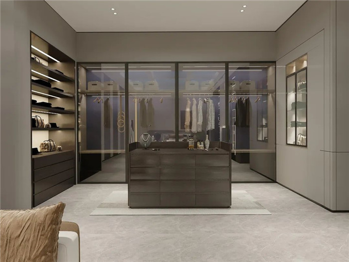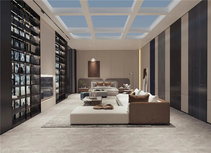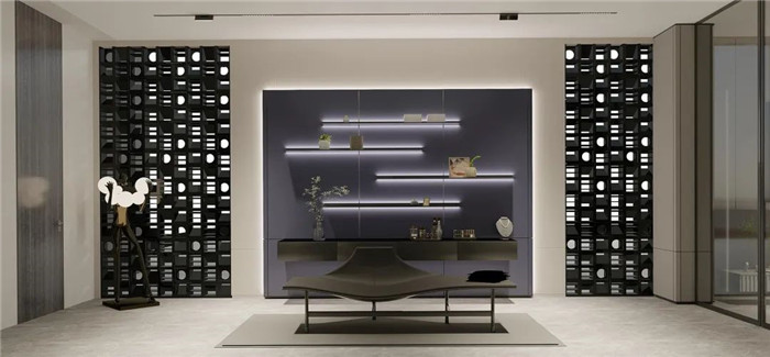 產(chǎn)品囊括了客廳、臥室、餐廳、衣帽間、書房等空間,讓家不僅僅是居住地,更是享受生活的地方??蛷d采用了一柜到頂?shù)娜X框架電視柜,背面搭配云石燈背景,簡約而不簡單;衣帽間采用時(shí)尚科技的電動平移巴士門,于細(xì)節(jié)之處彰顯魅力;餐廚空間墻面墻板整包,給人舒適溫馨之感;簡約式懸挑書柜設(shè)計(jì)搭配烤漆工藝超薄帶燈層板,氛圍感十足。