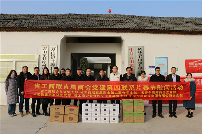 1月10日下午,省工商聯(lián)會員處黨支部、直屬商會黨建第四聯(lián)系片有關(guān)商會黨支部及會員企業(yè)黨支部代表赴廬江縣萬山鎮(zhèn)廿埠村開展走訪慰問活動(dòng),為廿埠村部分困難黨員、貧困群眾送去慰問金及大米、食用油、牛奶等生活物品。