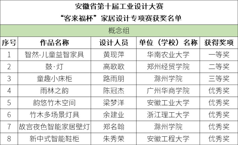 獲獎(jiǎng)名單公示 | 安徽省第十屆工業(yè)設(shè)計(jì)大賽“客來福杯”家居設(shè)計(jì)專項(xiàng)賽