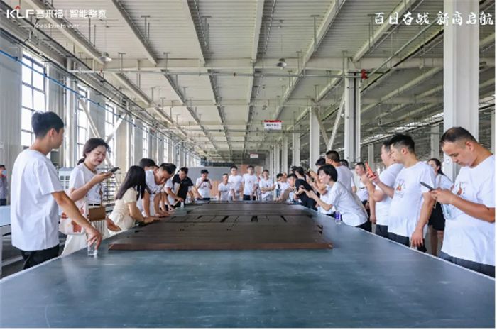 首站,大家來(lái)到了華東新橋生產(chǎn)基地。客來(lái)福董事長(zhǎng)尹其宏先生指引參觀路線,帶領(lǐng)大家充分了解各車(chē)間生產(chǎn)狀況。期間,他熱情介紹了新橋智能家居產(chǎn)業(yè)園完善的生產(chǎn)流程以及硬核裝備,如最新引入的德國(guó)進(jìn)口激光封邊機(jī)、木門(mén)自動(dòng)生產(chǎn)線等,收獲經(jīng)銷(xiāo)商伙伴的一致好評(píng)。