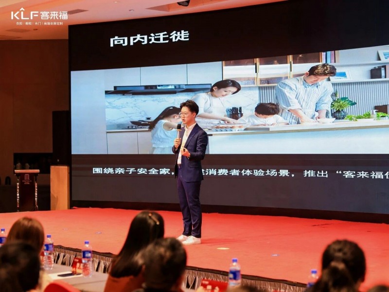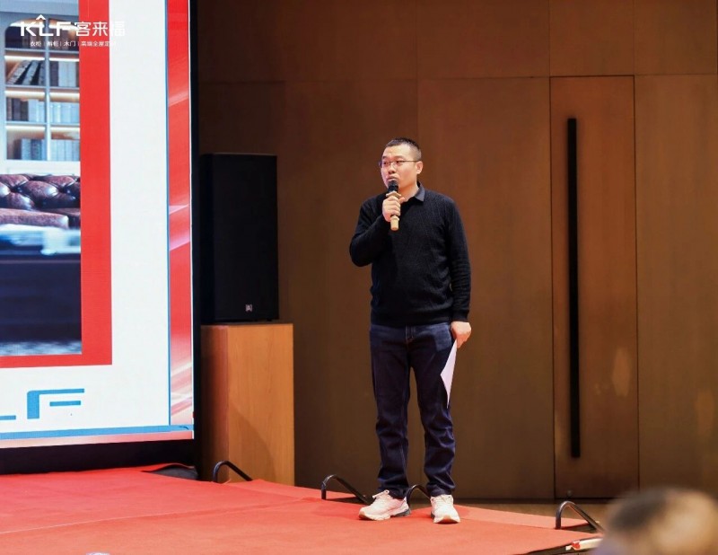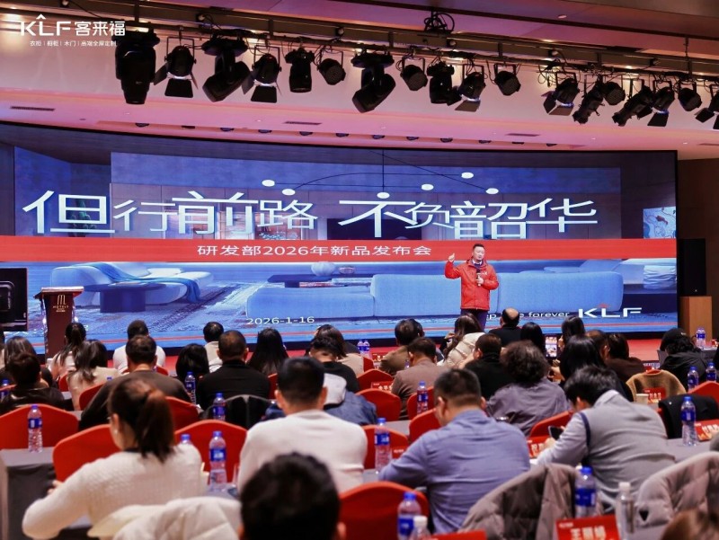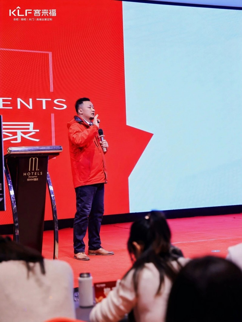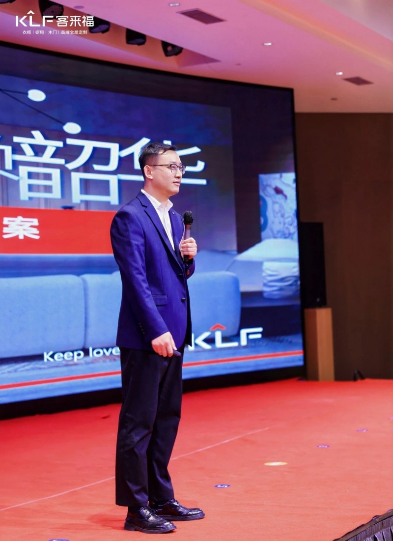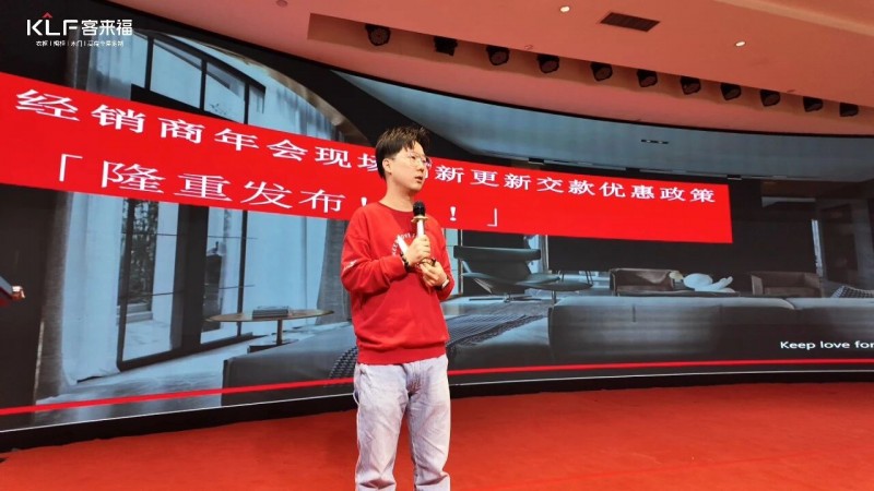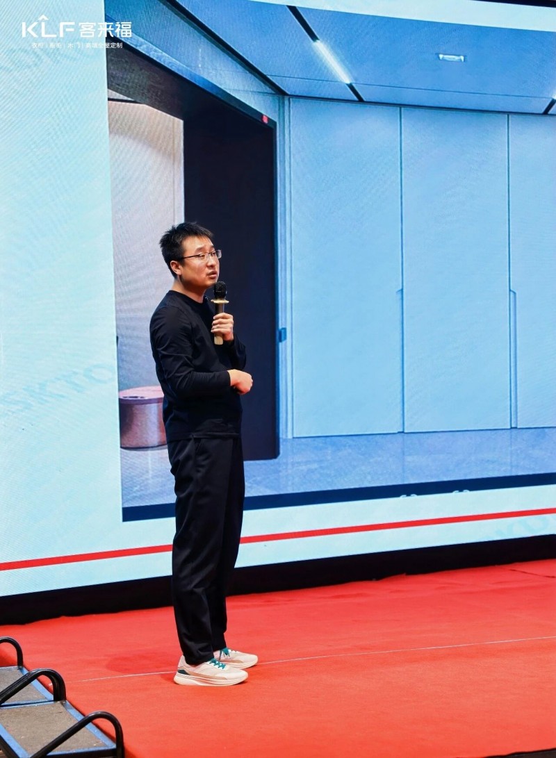 在熱烈的掌聲中,客來福商研部研發(fā)總監(jiān)劉云輝先生登臺,為全場經(jīng)銷商帶來了2026年度新品深度解析。從核心板材五金到前沿色彩搭配,再到整體空間解決方案,系統(tǒng)闡述了新品的競爭優(yōu)勢與匠心設(shè)計。干貨滿滿的分享,令在座合作伙伴對年度新品矩陣與市場前景有了清晰認(rèn)知,信心倍增。