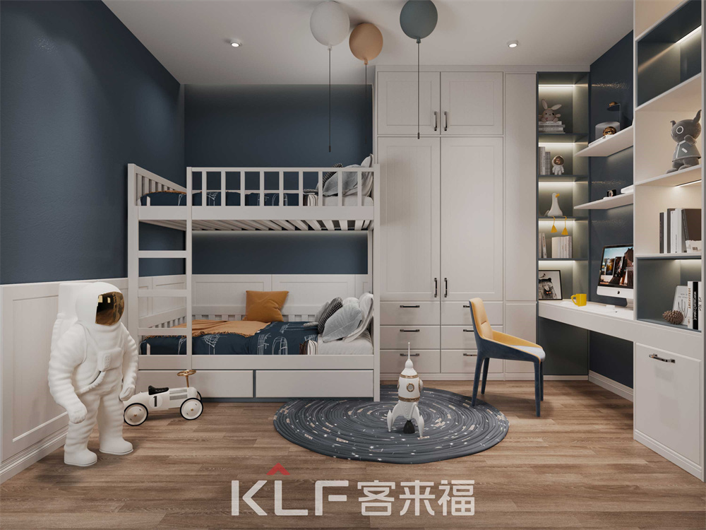 兒童房空間延伸了設(shè)計的色彩主題,不同飽和度的藍色配合深邃的星空藍,冷靜并充滿思考,L形的設(shè)計也被充分利用。