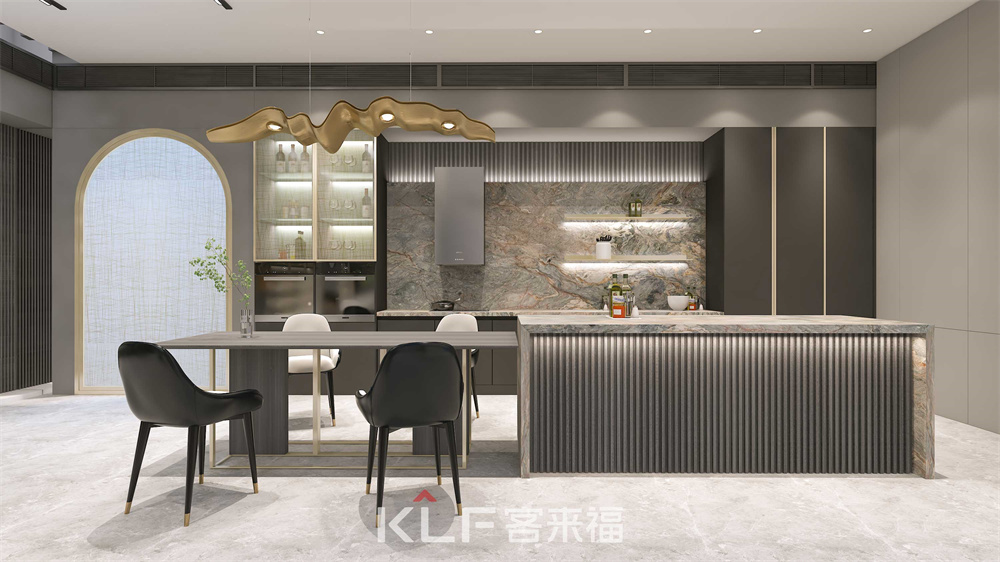 餐桌與島臺一體化連接,波紋的垂直設計,展現(xiàn)了餐廳空間的靈動感。冰箱采用內嵌式設計,外觀風格更加統(tǒng)一美觀。直筒油煙機將做飯時的油煙盡收其中,避免空間內大面積油煙四散,保持空間環(huán)境清潔干爽。